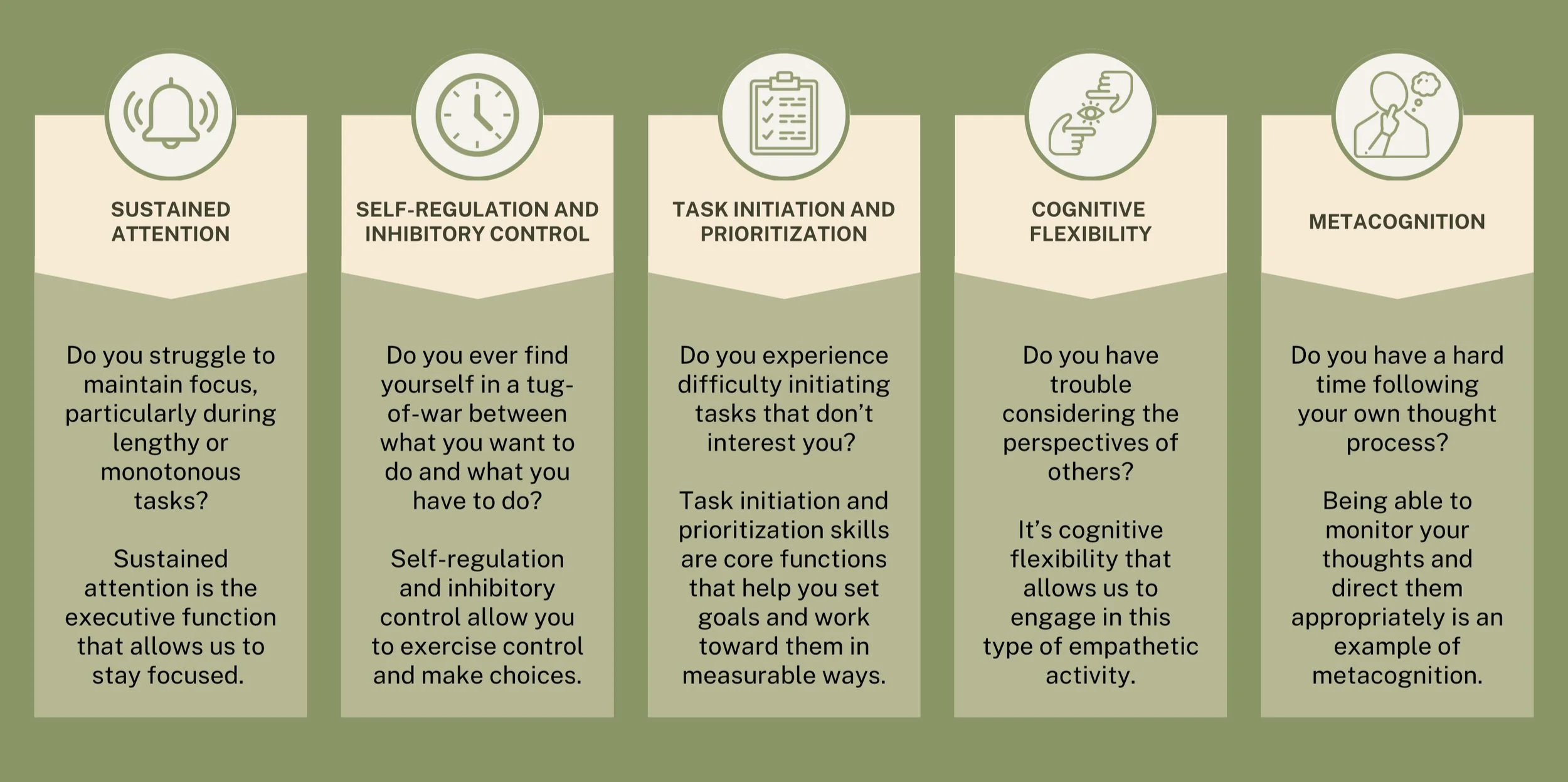 “Executive Functioning” refers to a set of cognitive skills that help people regulate their thoughts and actions to achieve goals. Demands on Executive Functioning intensify as we move through our lives. What once may have been manageable obligations and stressors can evolve into complex and overwhelming hurdles. Educational institutions routinely fail to develop these critical skills—but it’s never too late to build them. Nearly everyone at any stage of life can benefit from improved Executive Functioning, particularly as the individual prepares for a life transition or a new challenge.